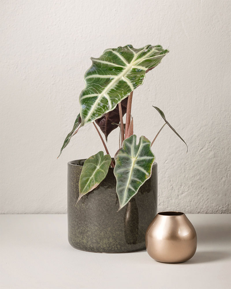 Alocasia Polly tillhör familjen kallaväxter och har sitt ursprung i Sydostasien. Den har mörkgröna, sköldlika blad med ljus ådring som ser ut som ett skelett. Därför kallas den även för Skelettsköld.