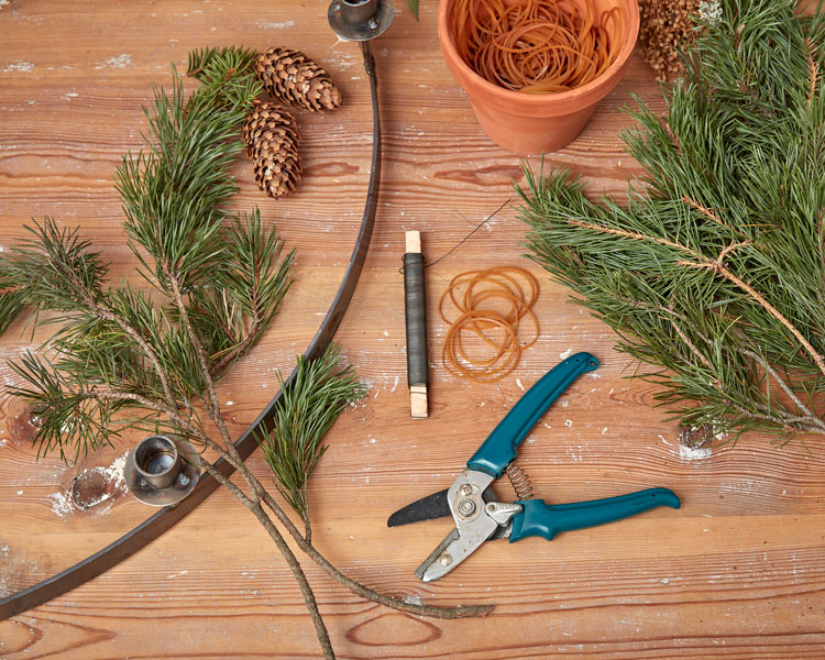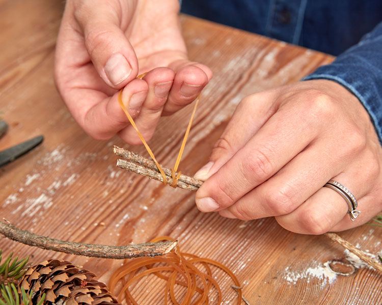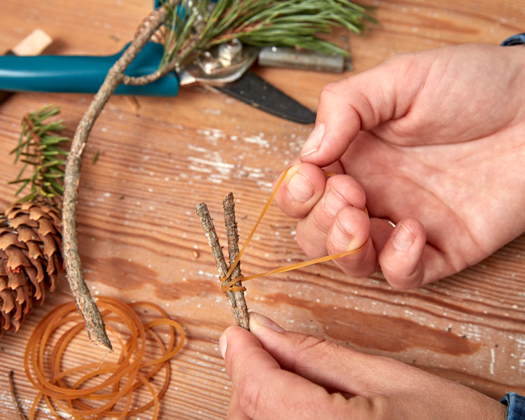 1. Klipp två lika långa kvistar av exempelvis tall, de ska vara cirka 20–25 cm.