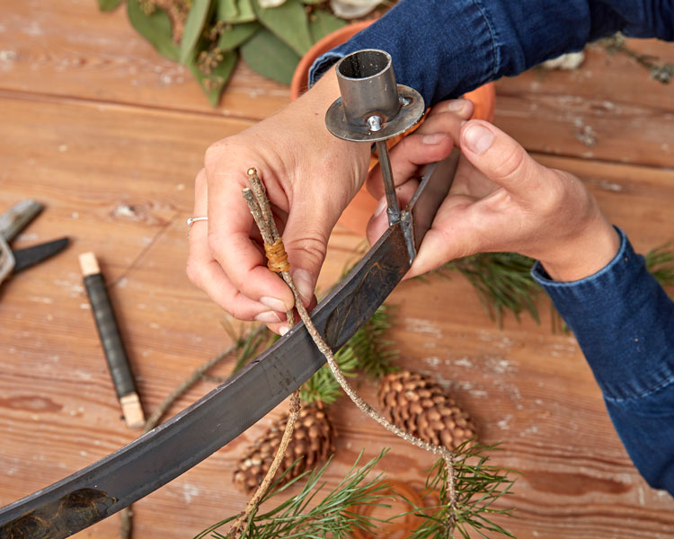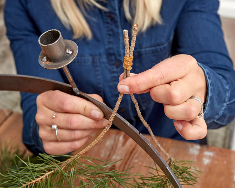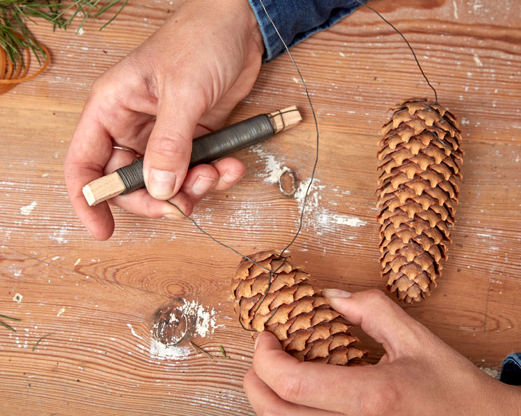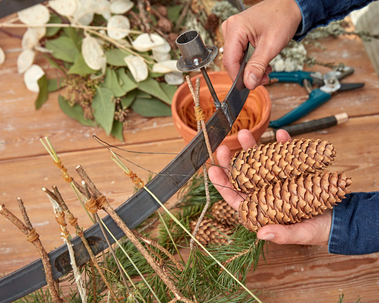 4. Surra fast ståltråd runt en kotte, toppen neråt. Böj ståltråden över kanten på takkronans stomme så att kotten linjerar med raden av kvistar. Surra fast en till kotte i ståltrådens andra ände, så att den också linjerar med allt övrigt som fyller takkronan.