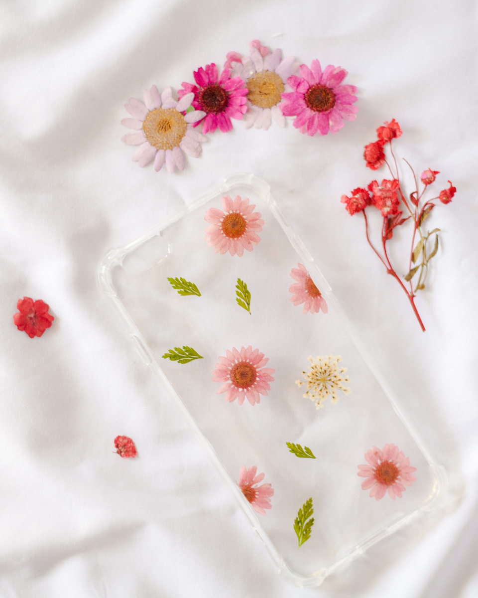 2 Om du vill vara på säkra sidan kan du limma fast dina blomdelar försiktigt inuti mobilskalet, med ett klart lim. Men det går också bra att bara lägga ut delarna i ett fint mönster utan att fästa dem. Använd pincett!
