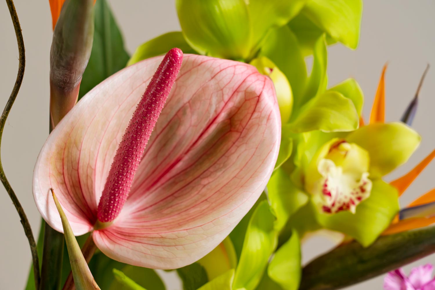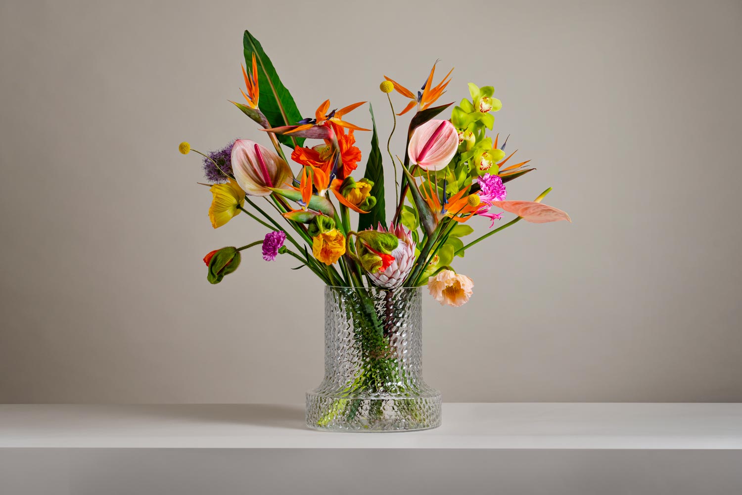 Här har hon valt sorter som papegojblomma, cymbidiumorkidé, anturium, kungsprotea, allium, lilja, solboll, nejlika och nerine.
