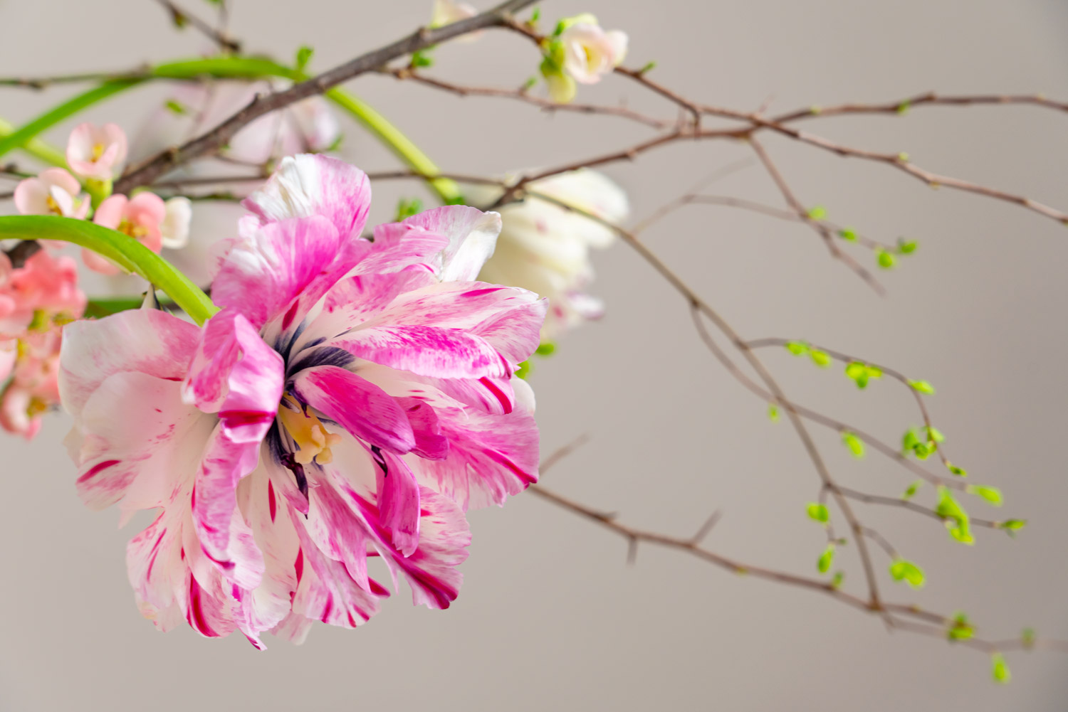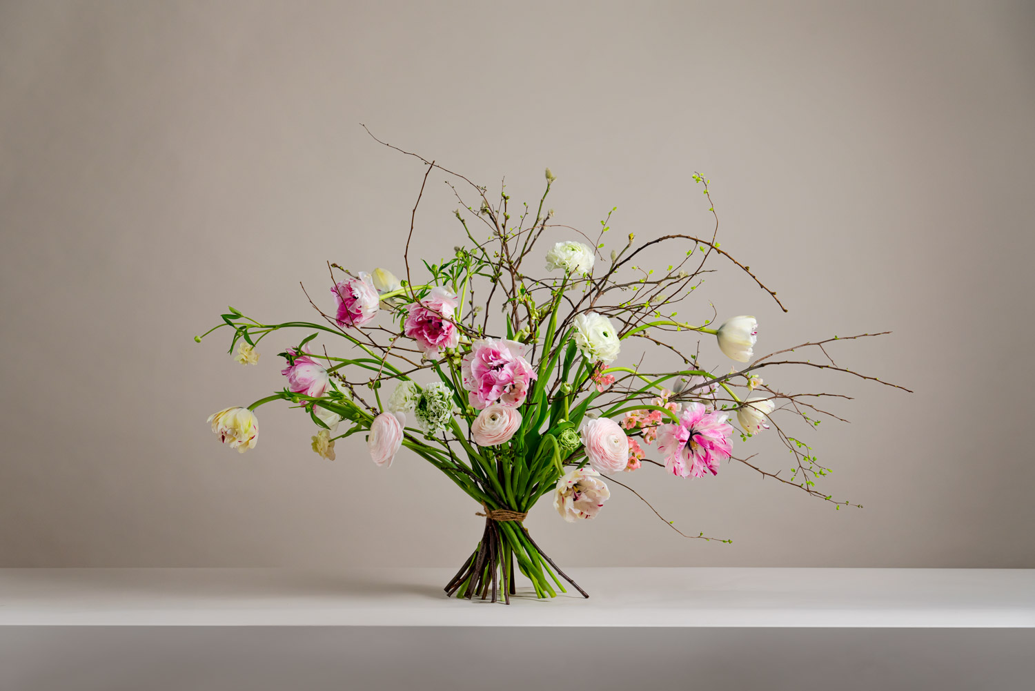 I buketten Vårljus sträcker sig just långstjälkade franska tulpaner uppåt och utåt sidorna tillsammans med blommande kvistar och spektakulära ranunkeln ’Clooney’.