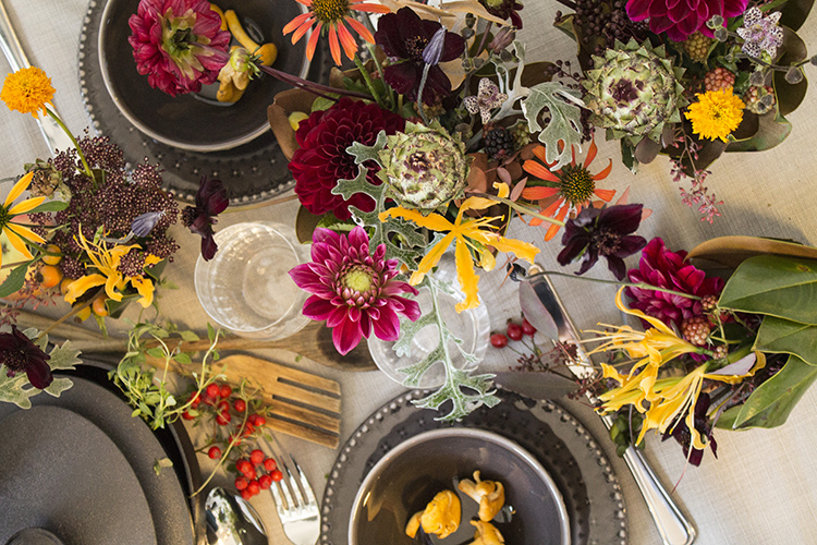 Ett tips är att göra många små buketter av sensommarens färgstarka favoriter som chokladblomma, dahlia och solhatt blandat med björnbär, nypon och jordärtskocka. Resultatet blir vilt och vackert! Är du sugen på att slå på stort? Plocka blommor och grönt från trädgård och natur och kombinera med spännande köpeblommor! Gul klänglilja (gloriosa) och orkidéer ger en exotisk touch till din dekoration.