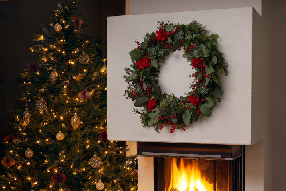 Över den öppna spisen hänger en vacker julkrans i rött och grönt som förgyller julstämningen under glöggfesten. Kransen är bunden med blandat grönt, röda nejlikor och ilex.