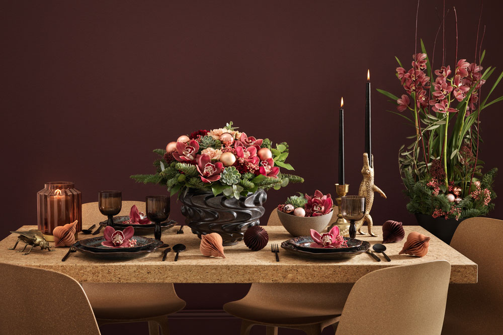 För att få till den trendiga stilen har vi här dukat på både höjden och bredden. Bakom bordet står en Lyxplantering med orkidé, som är en trendig julplantering i rosa och röda färgtoner.