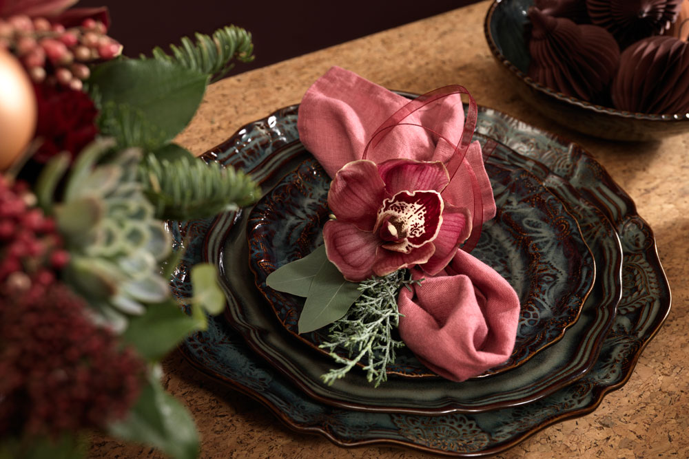 På tallrikarna ligger det servetter med servettringar gjorda av cynbidiumorkidé, gröna kvistar och ett matchande band.